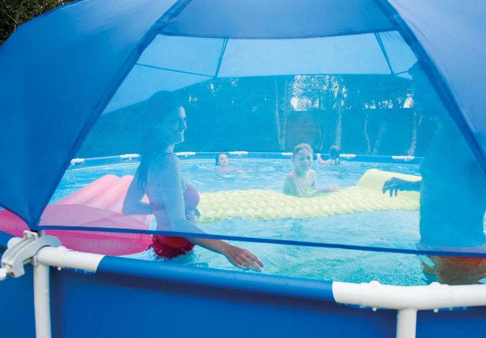 Солнцезащитный зонт Интекс 28050 подходит для всех бассейнов INTEX Frame pool. Установка навеса занимает минимум времени, но при этом крепится очень прочно. Каркас Зонта POOL CANOPY сделан из прочного материала и выдерживает скорость ветра до 19 км / ч.