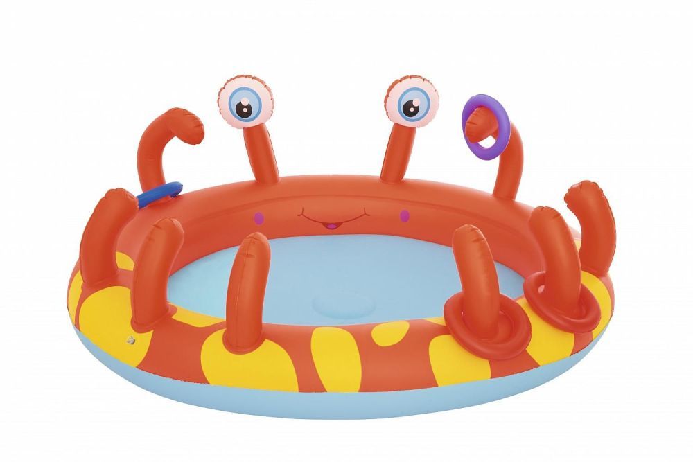 Ваш ребенок от купания в компактном надувном бассейне в виде веселого краба останется довольным. Разбрызгиватель, что в лапках у краба освежит в жару. Достаточно нажать на выпуклость в центре, чтобы он заработал.