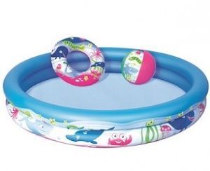 В комплекте с бассейном надувные мяч и круг в цвет бассейна.