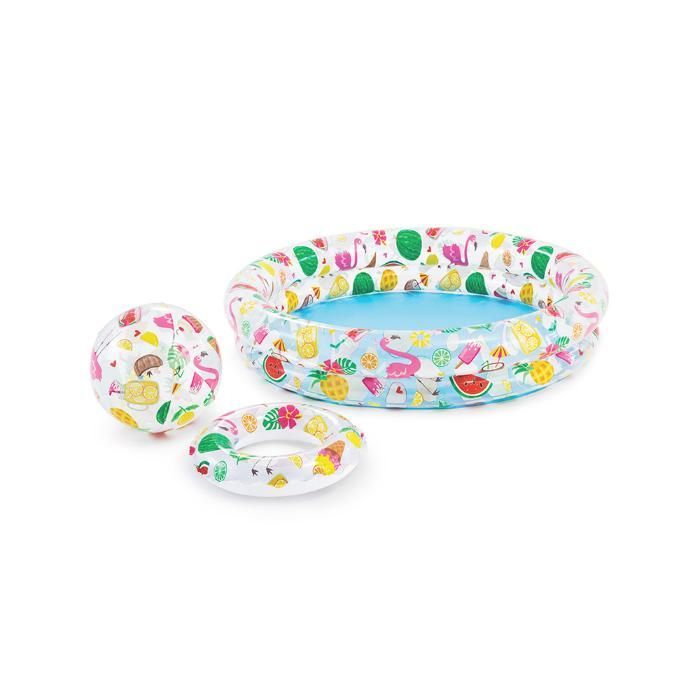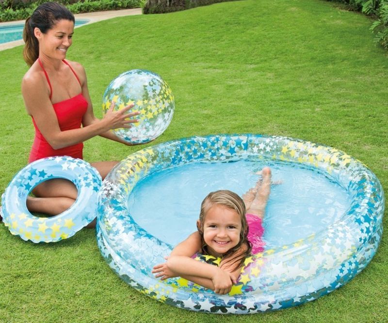 - Этот яркий надувной бассейн предназначен для самых маленьких купальщиков. Чтобы игра в бассейне была интереснее и задорнее, в комплекте к бассейну прилагаются плавательный круг и надувной мяч той же расцветки.