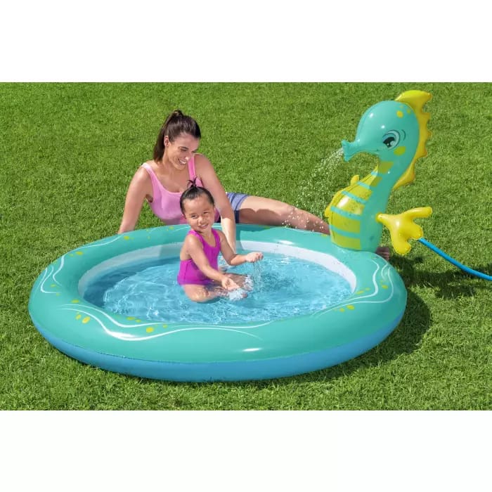 Детский бассейн BESTWAY с разбрызгивателем в виде морского конька. С ним купаться еще веселее: разбрызгиватель работает как душ и создает эффект летнего дождя. Занимает детей, пока вы работаете на даче. Размер бассейна подходит для детей от 3 лет.Подсоединяется к садовому шлангу.