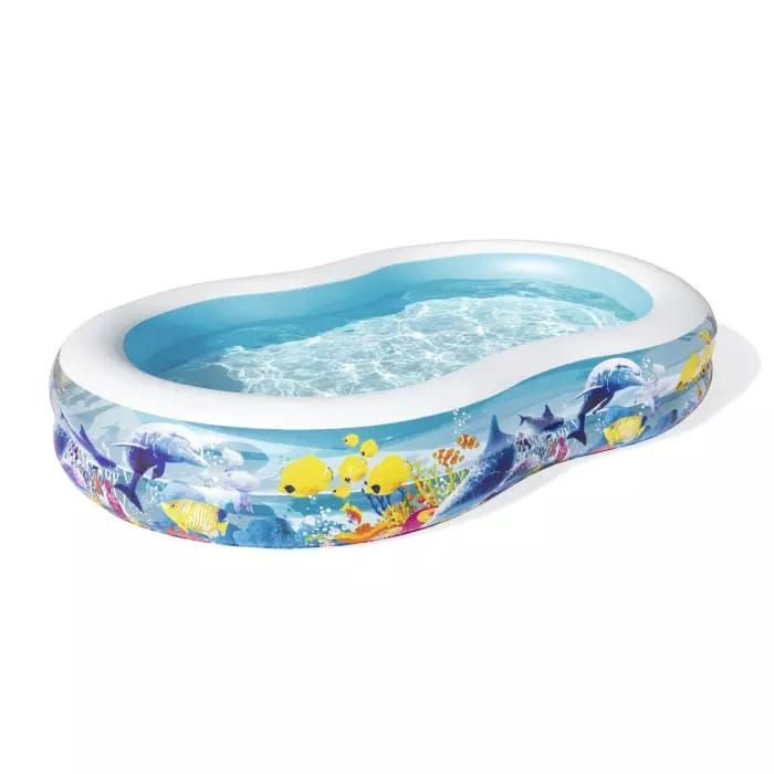 Прямоугольный семейный надувной бассейн Bestway "Подводный мир" для взрослых детей от 6 лет. Изготовлен из высококачественного винила, устойчивый, надежный и безопасный. Имеет мягкие стенки с широкими бортиками и жесткое дно из ПВХ-пленки.