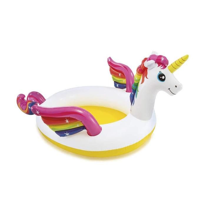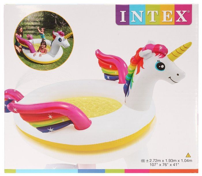 Детский бассейн с фонтаном "Мистический единорог" Intex: 57441Надувной бассейн единорог выглядит очень красочно. В комплекте идет насадка, которая крепится на садовый шланг и прикрепляется к единорогу и создает эффект фонтана, детям очень нравится купаться и играться в данном бассейне.Отличный вариант как развлекать детей в саду!Комплектация:Размер: 272х193х104 смВес в упаковке 4 кг.