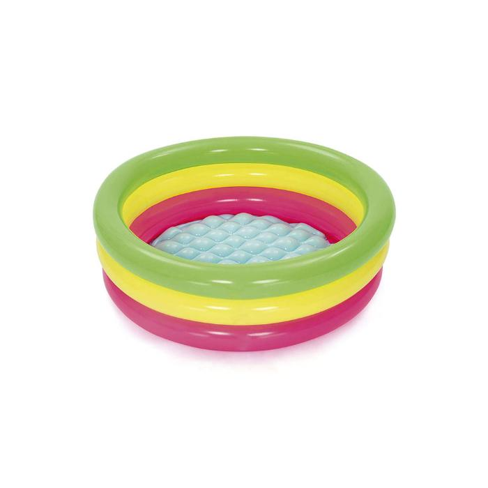 Надувной круглый однотонный бассейн Bestway для детей от 2 лет. Изготовлен из высококачественного винила, прочный, устойчивый, надежный и безопасный. Имеет мягкие стенки с широким бортиком и мягкое надувное дно.