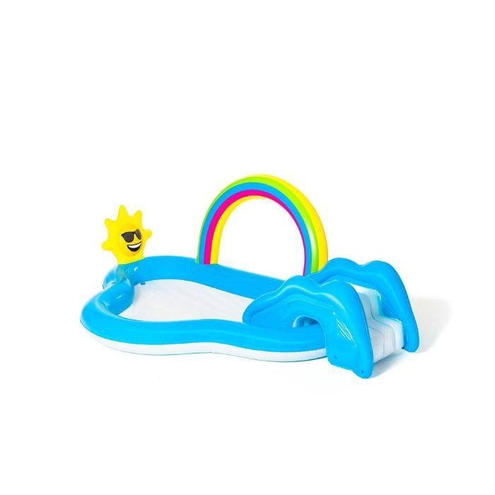 Яркий, мягкий игровой центр с горкой и с ярким дизайном для веселого времяпрепровождения в летние деньки. Придется по вкусу вашему ребенку, чтобы поиграть в любимые игрушки, понежиться в прохладной воде. Радужная арка и солнышко привлекут внимание девочек и мальчиков.Бассейн игровой Блеск радуги достаточно вместителен. Оснащен съемной горкой со стяжными канатами и встроенным распылителем-фонтаном воды, который без труда подключается к садовому шлангу.