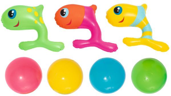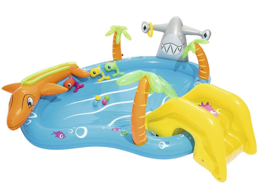 Бассейн, 4 мяча, надувное кольцо, горка, надувная подушка, 3 надувные рыбки, ремкомплект.
