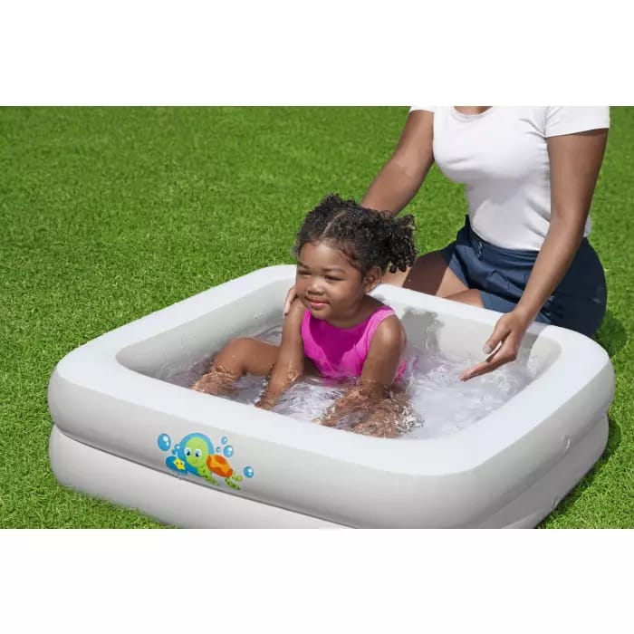 Надувной прямоугольный бассейн Bestway для малышей до 3 лет. Изготовлен из высококачественного винила, прочный, устойчивый, надежный и безопасный. Имеет мягкие стенки с широким бортиком и мягкое надувное дно.