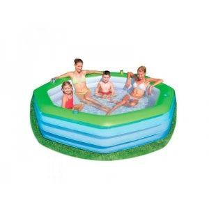 Восьмиугольный семейный надувной бассейн Bestway серии Делюкс для взрослых детей от 6 лет. Изготовлен из высококачественного винила, устойчивый, надежный и безопасный. Имеет мягкие стенки с широкими бортиками и жесткое дно из ПВХ-пленки.