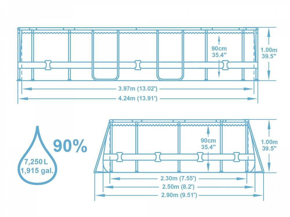 • Объем при 90% заполнении бассейна: 7250 литров