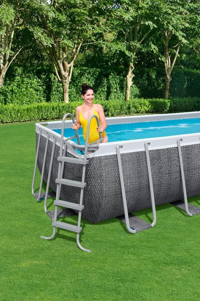 Прямоугольный каркасный бассейн Bestway Power Steel с комплектующими: лестница, тент, поплавок дозатор, фильтр-насос. Модель несложно разместить на ровной площадке. Будет отличаться повышенным уровнем комфорта.