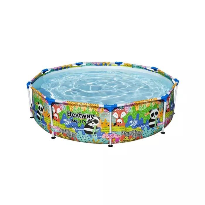 Каркасный бассейн Bestway 5612F отличается яркой расцветкой. Чаша выполнена из высококачественного трехслойного ПВХ: два слоя плотного винила и между ними сетка из полиэстера для особой прочности. Цвет чаши бассейна снаружи разноцветный с элементами джунглей и диких животных. Каркас металлический, покрытый предотвращающим появление коррозии слоем пластика.