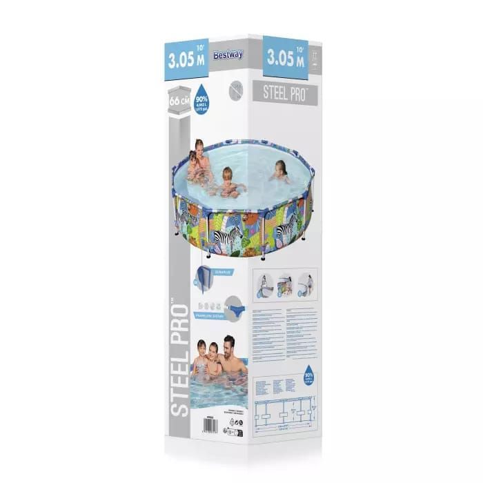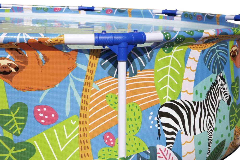 Каркасный бассейн Bestway 56985 отличается яркой расцветкой. Чаша выполнена из высококачественного трехслойного ПВХ: два слоя плотного винила и между ними сетка из полиэстера для особой прочности. Цвет чаши бассейна снаружи разноцветный с элементами джунглей и диких животных. Каркас металлический, покрытый предотвращающим появление коррозии слоем пластика.