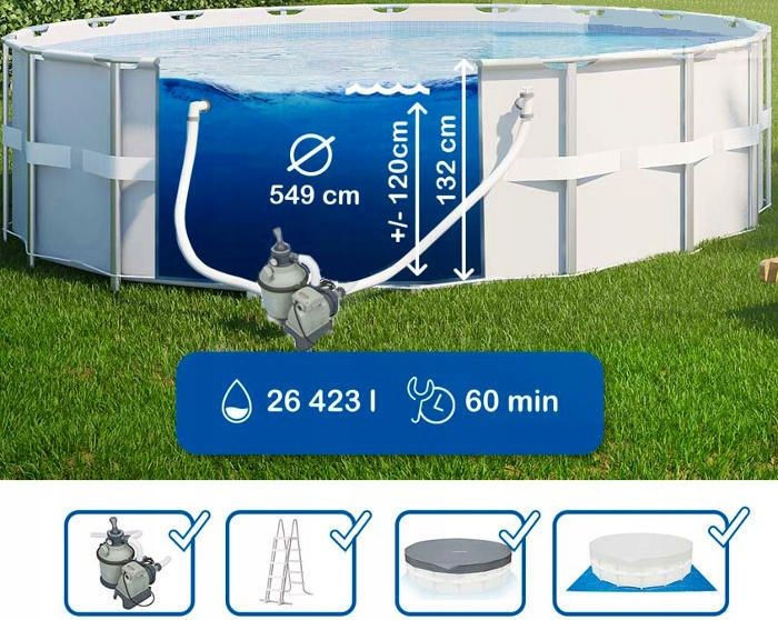 Каркасный бассейн Ultra Frame, 549х132см, 26423л, песочн.фил-насос, лестница, тент, подстилка, Intex, 28332