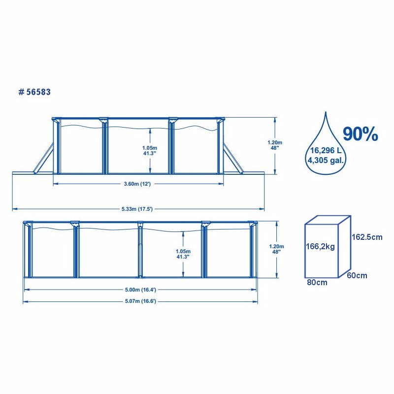 Объем - 16296 лФильтр-насос мощностью 3028л/чРазмер - 500х360х120 смВес - 176,98 кгКомплектация