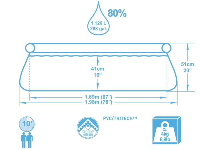Для установки бассейна нужна плоская, горизонтальная площадка. Время сборки и подключения бассейна не более 10-15 минут. На холодное время года не рекомендуем оставлять бассейн на открытом воздухе.
