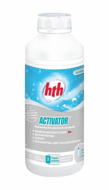 Первичная обработка: Используйте hth АКТИВНЫЙ КИСЛОРОД, влейте 300 мл hth АКТИВАТОРА ДЛЯ ТАБЛЕТОК АКТИВНОГО КИСЛОРОДА на 15м3 воды прямо в бассейн при работающей фильтрации.