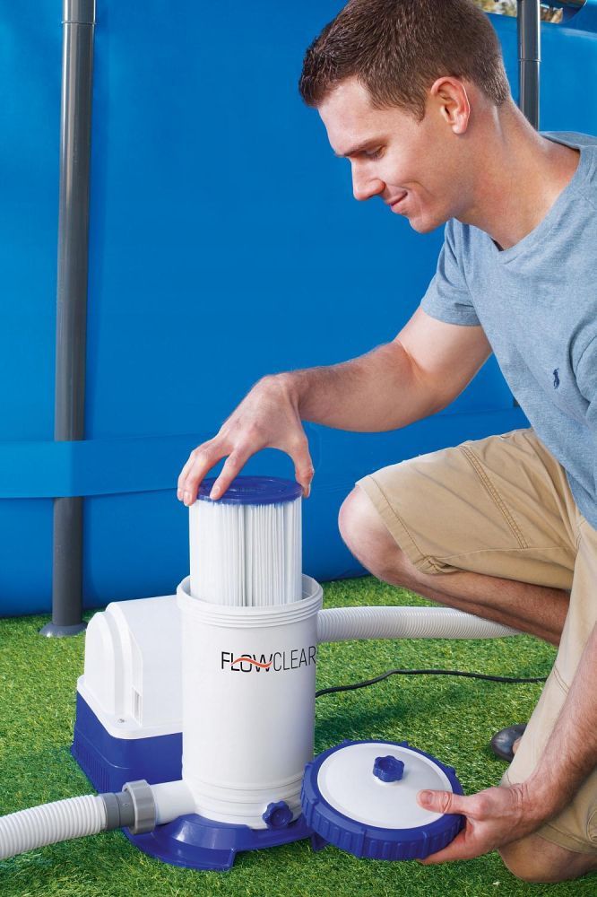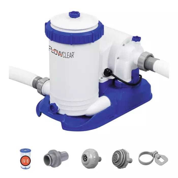 Фильтр-насос картриджного типа Bestway 9463 л/час создает качественную циркуляцию и отличную очистку воды от внешних загрязнителей. Крепится к стенке бассейна двумя гофрированными шлангами, работает от напряжения в 220 В. Используется вместе с картриджем типа IV, который нужно менять раз в несколько недель.